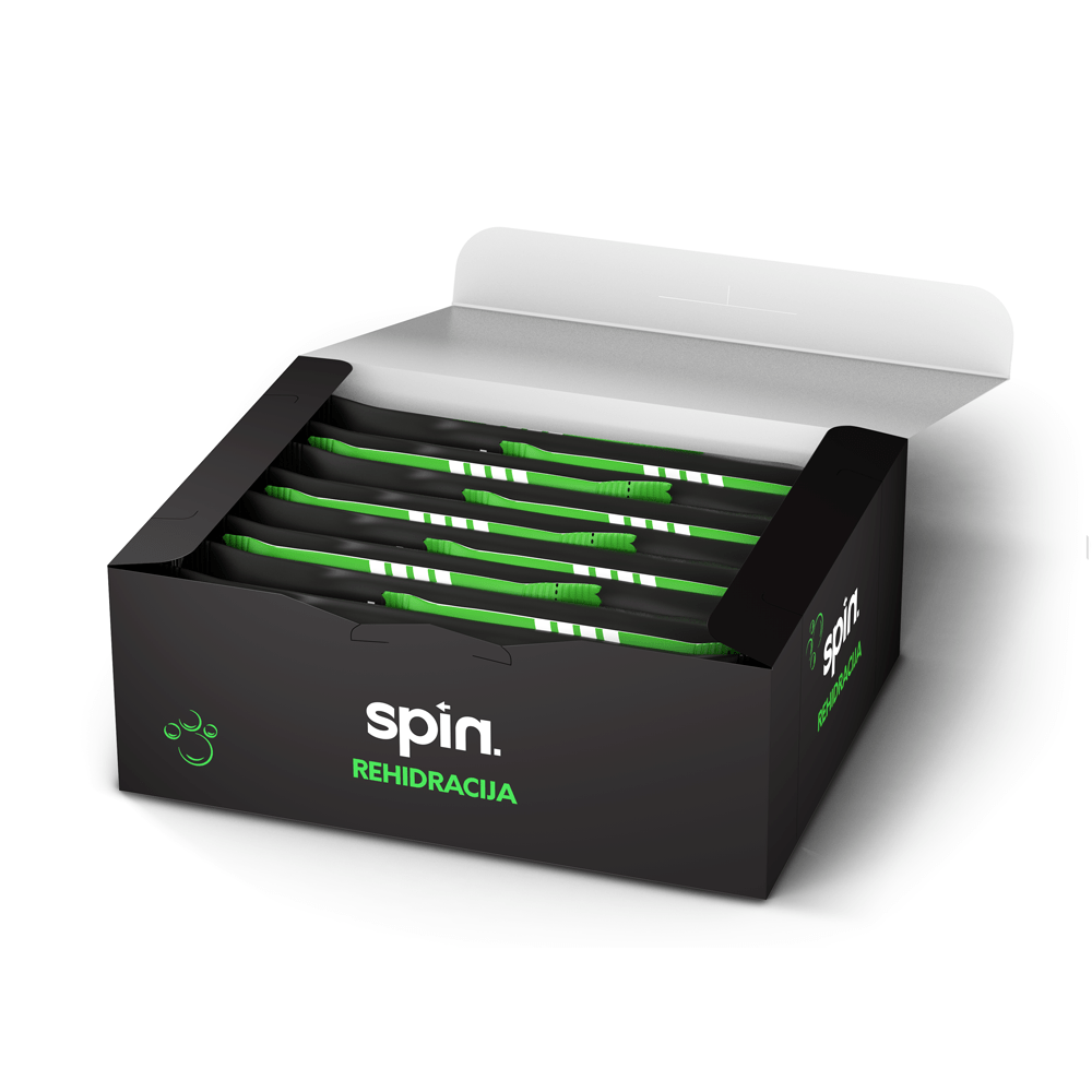 Uputa za upotrebu: SPIN je kombinacija napitka koji sadrži šećere i kapsula koje sadrže soli natrija i magnezija. Veća vrećica sadrži prah za pripremu napitka. Sadržaj veće vrećice stavite u 500 ml (0,5 litara)vode i promiješajte. U manjoj vrećici su dvije kapsule koje sadrže elektrolite (soli natrija i magnezija). Dvije kapsule popijte s pripremljenim napitkom.